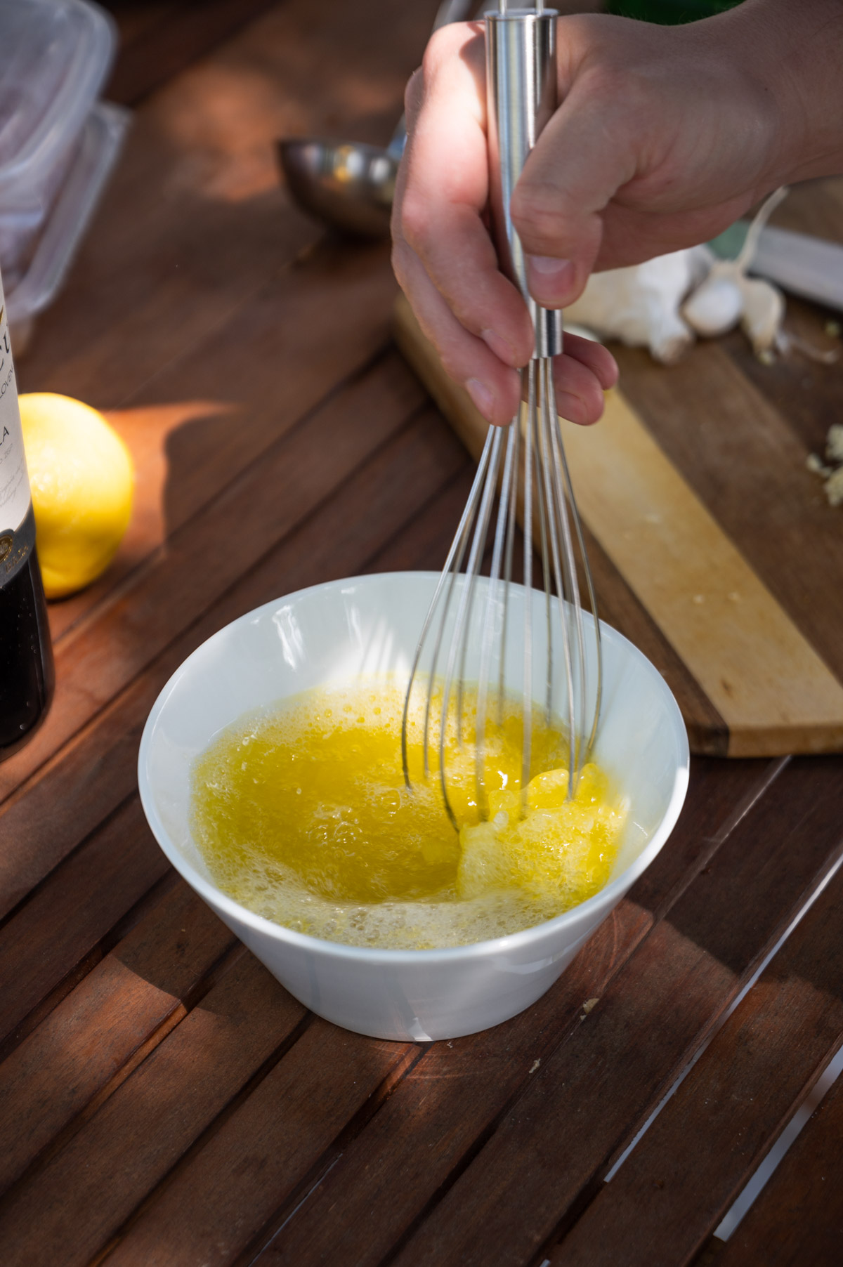 - V posodico natoči po deci oljčnega olja in belega vina ter dodaj na fino sesekljan česen.