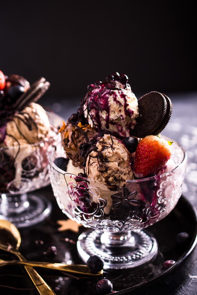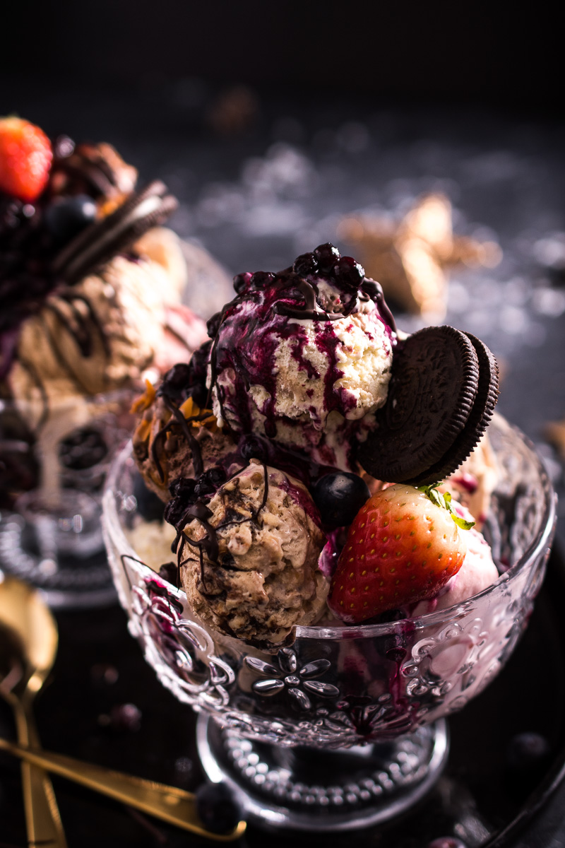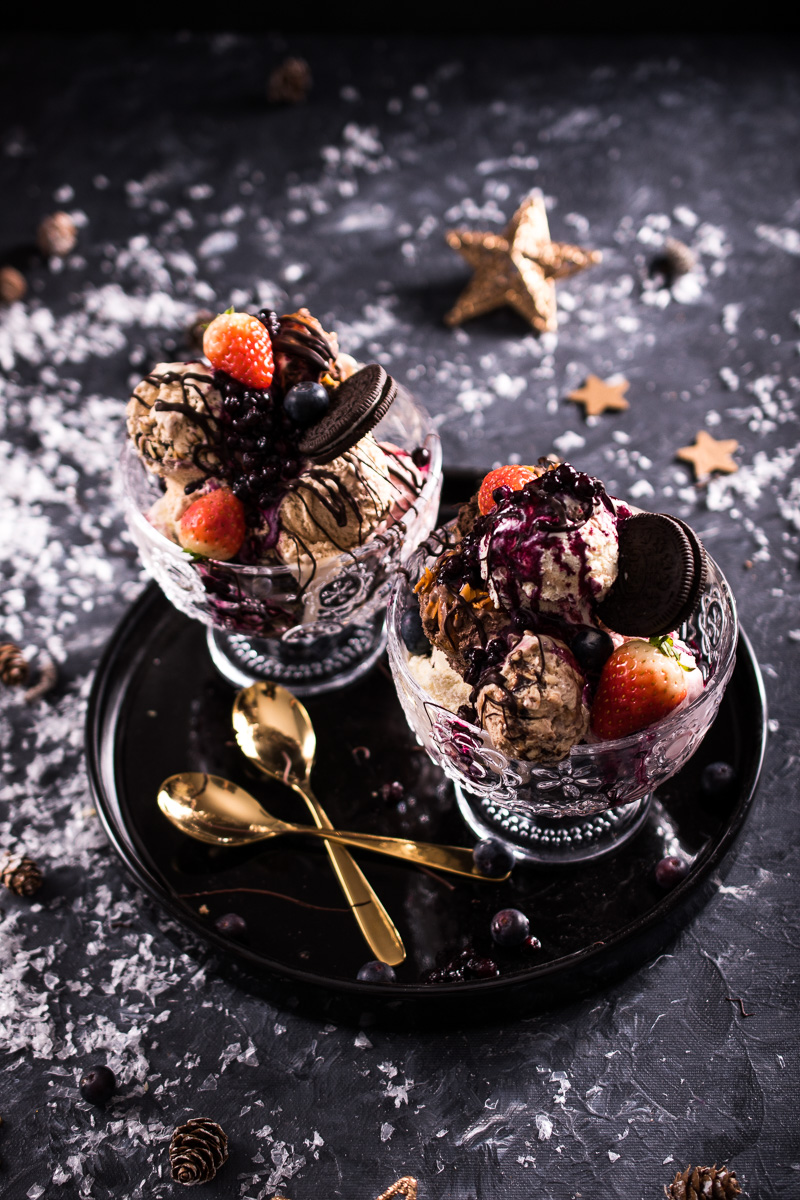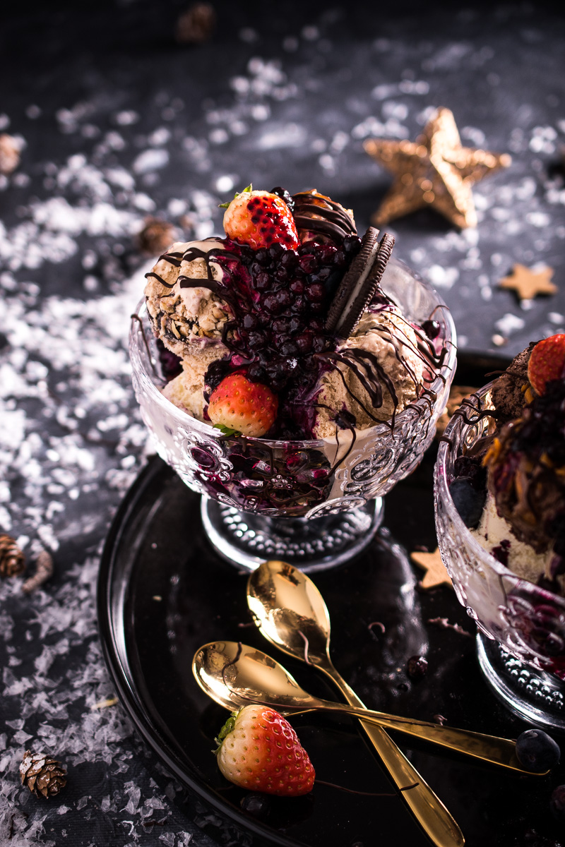 Ko čez kupo poliješ še vroč preliv iz borovnic, ne odlašaj več. Pogumno zagrizi v sladoledni izziv.