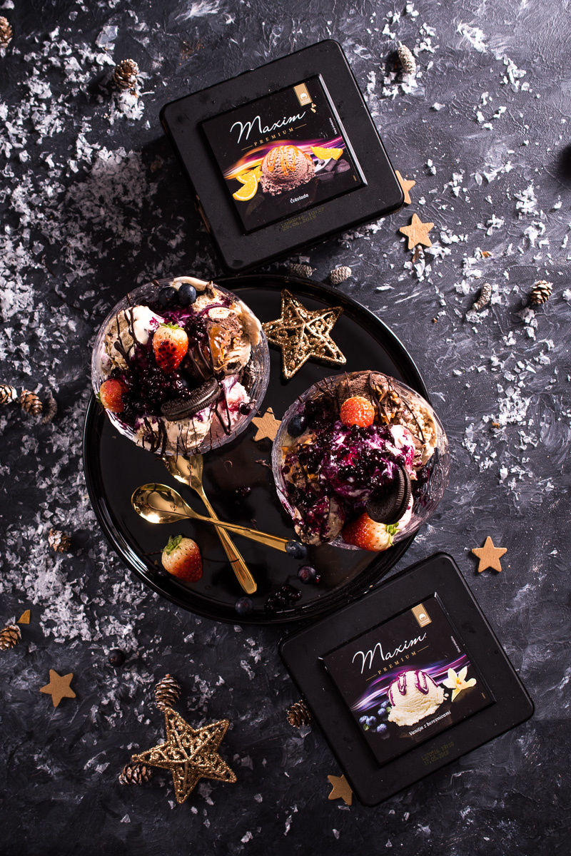 Za gradnjo sladolednega nebotičnika, v katerem se skriva sadje, potrebuješ vrhunski sladoled. Starodavni rek pravi: “Kupa je le toliko dobra, kolikor je dober sladoled”. Midva sva si zato nagrabila celo kolekcijo odličnih sladoledov Maxim premium, ki so najbolj znani po tem, da po odprtju embalaže kar izpuhtijo.