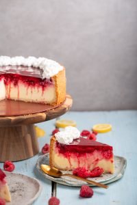Jogurtovo-kokosova luknjasta torta z malinami – brez moke