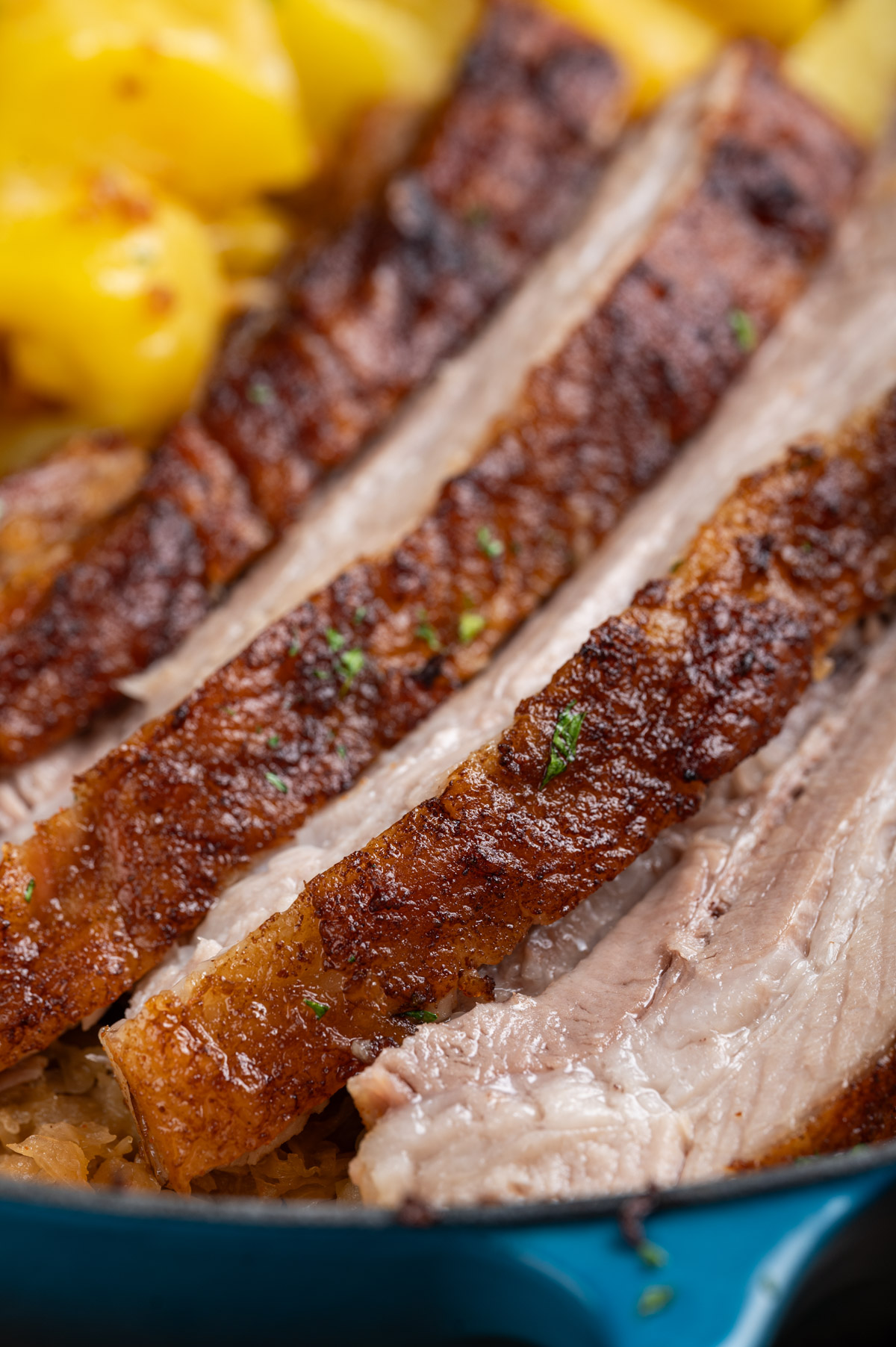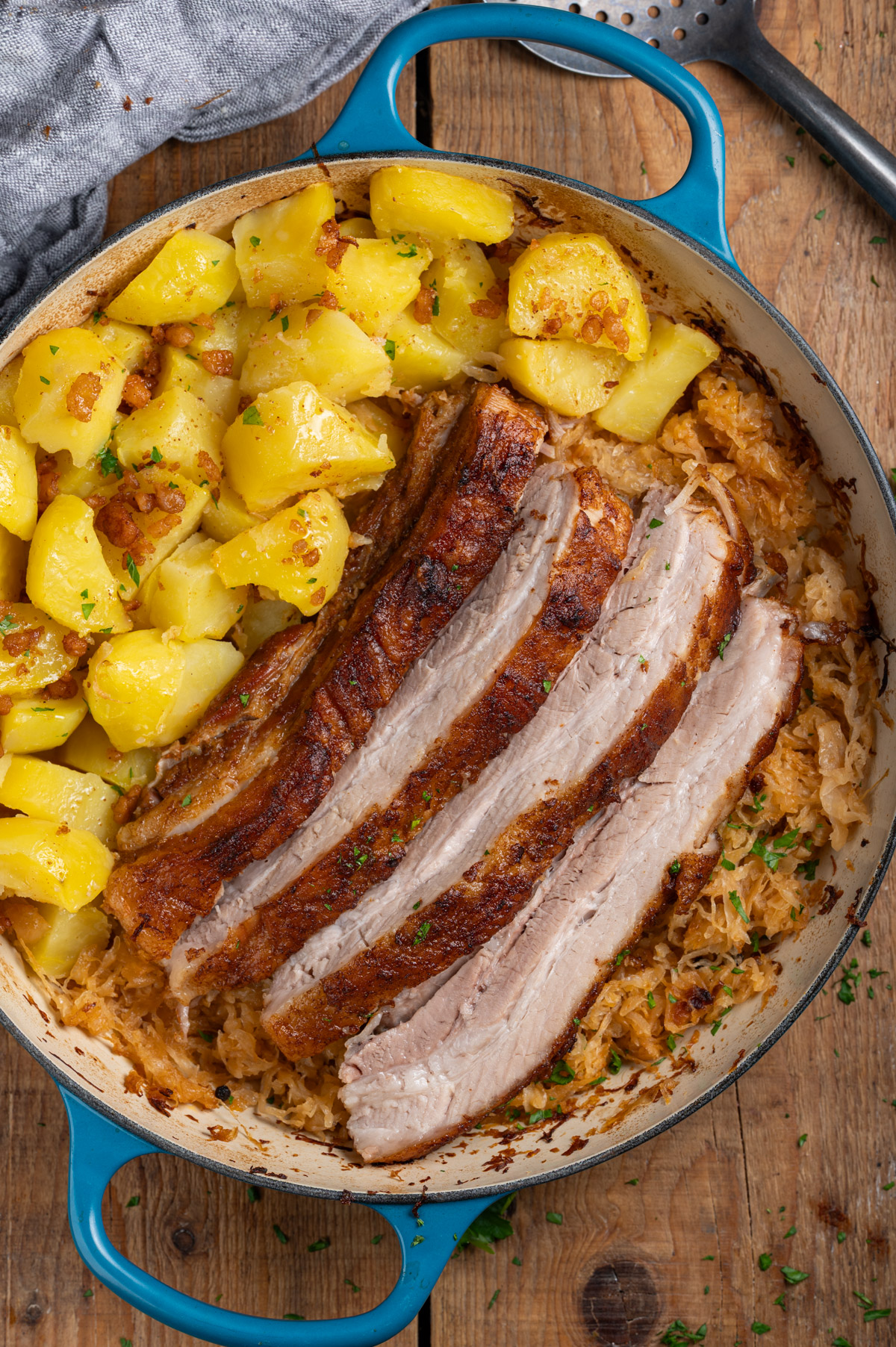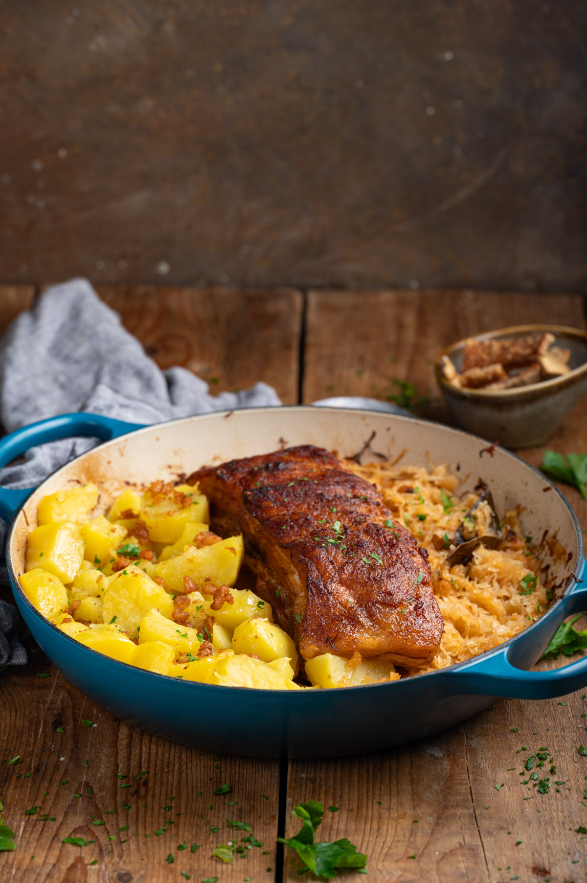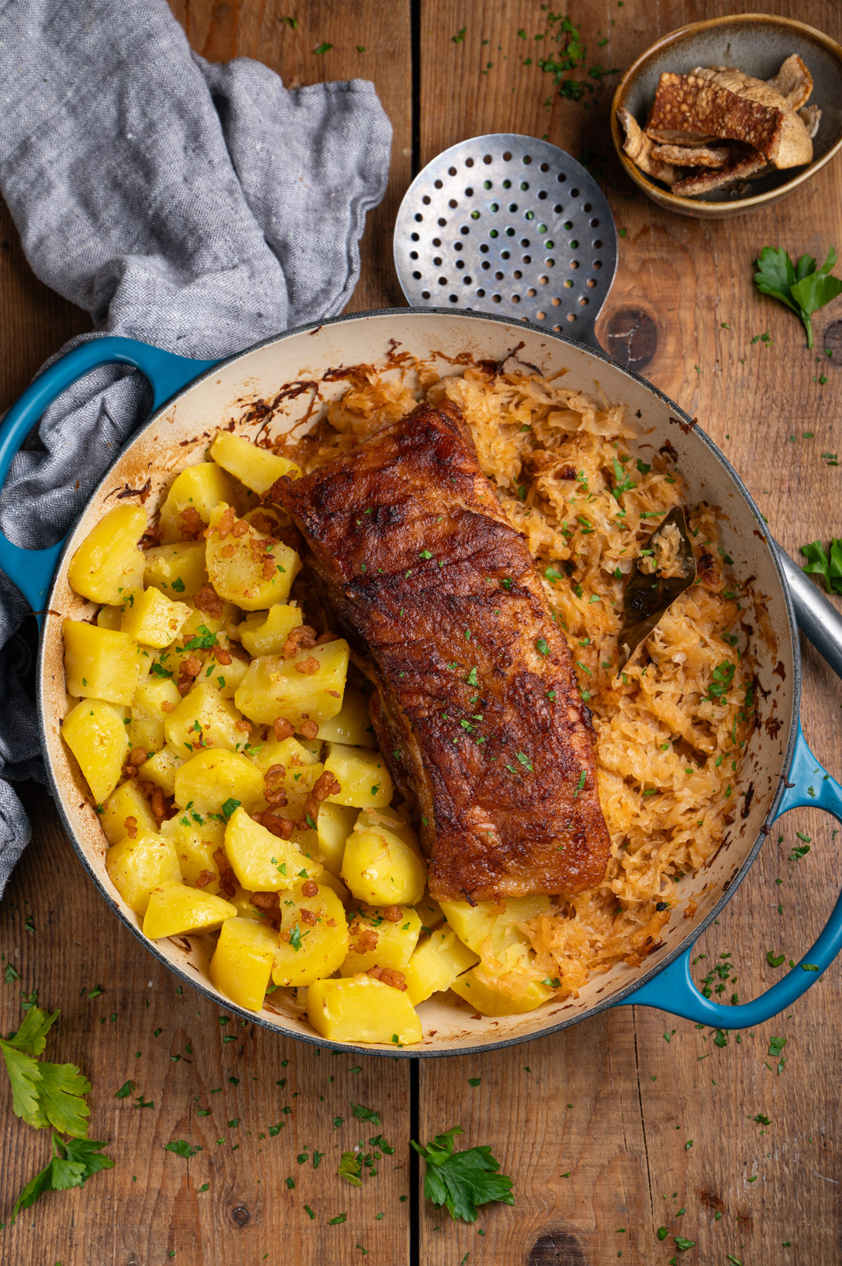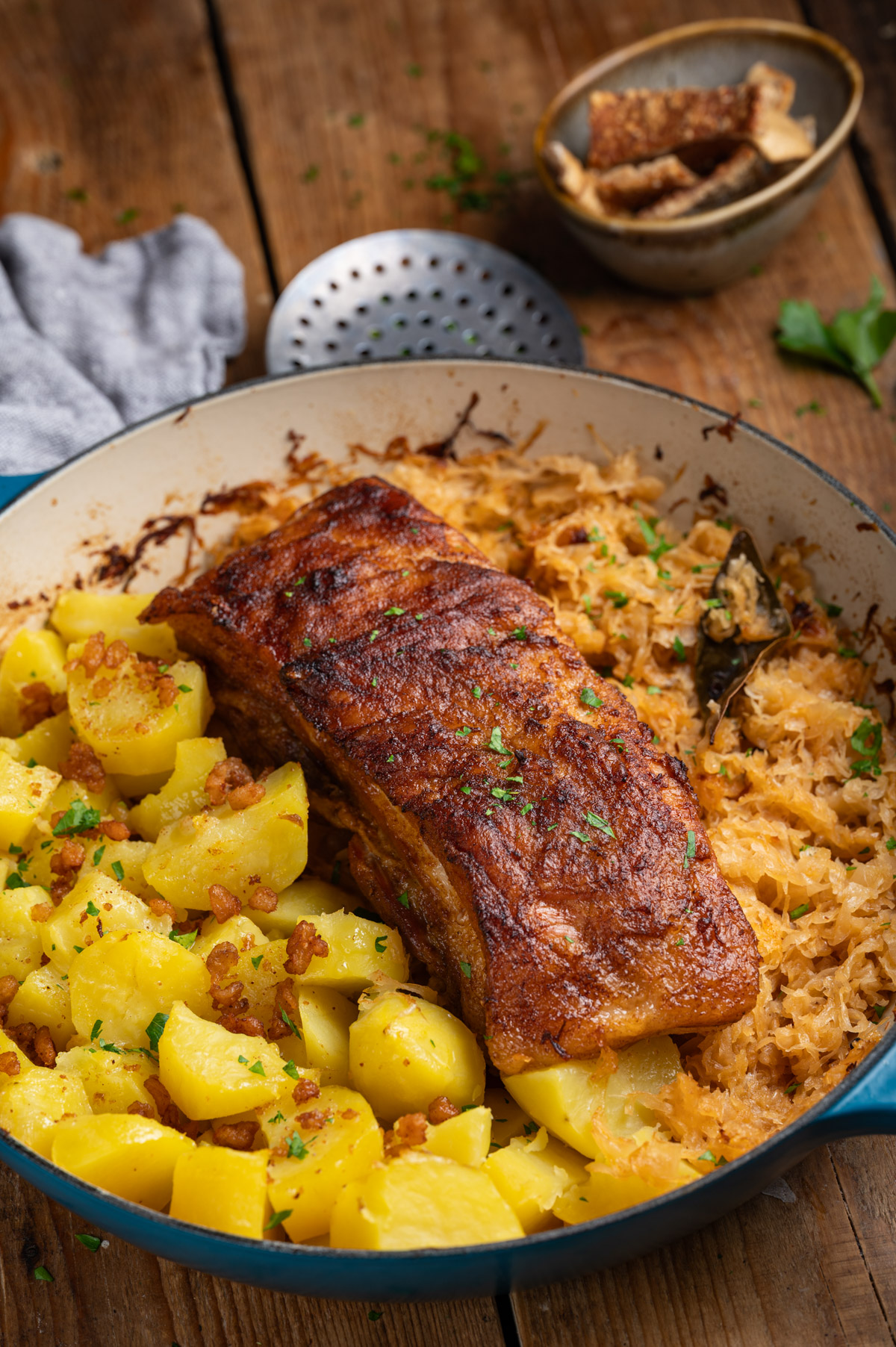 Da bo pust res mastnih in v nasmešek raztegnjenih ust, si družno preštejmo rebra. Klasiko svinjskega mesa, kislega zelja in krompirja sva tokrat našemila v bolj praktično izvedbo – vse vkup sva stlačila v en pisker.