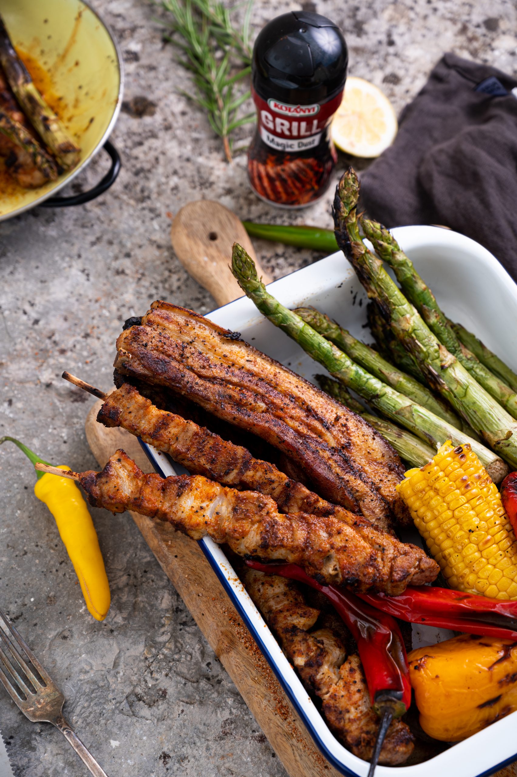 - Tako ražnjiče kot rebrca dobro natri z nepogrešljivo Magic Dust začimbo, jih prelij z nekaj žlicami oljčnega olja in jih pusti 30 minut pri miru na sobni temperaturi.